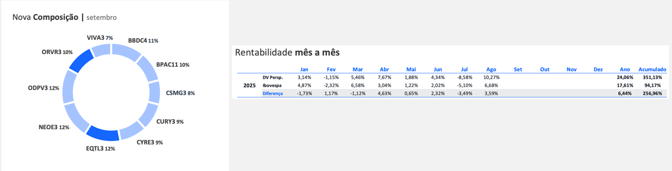A carteira perspectiva teve valorização de 10,3% no mês de agosto, superando o Ibovespa, que subiu 6,7% no mesmo período.