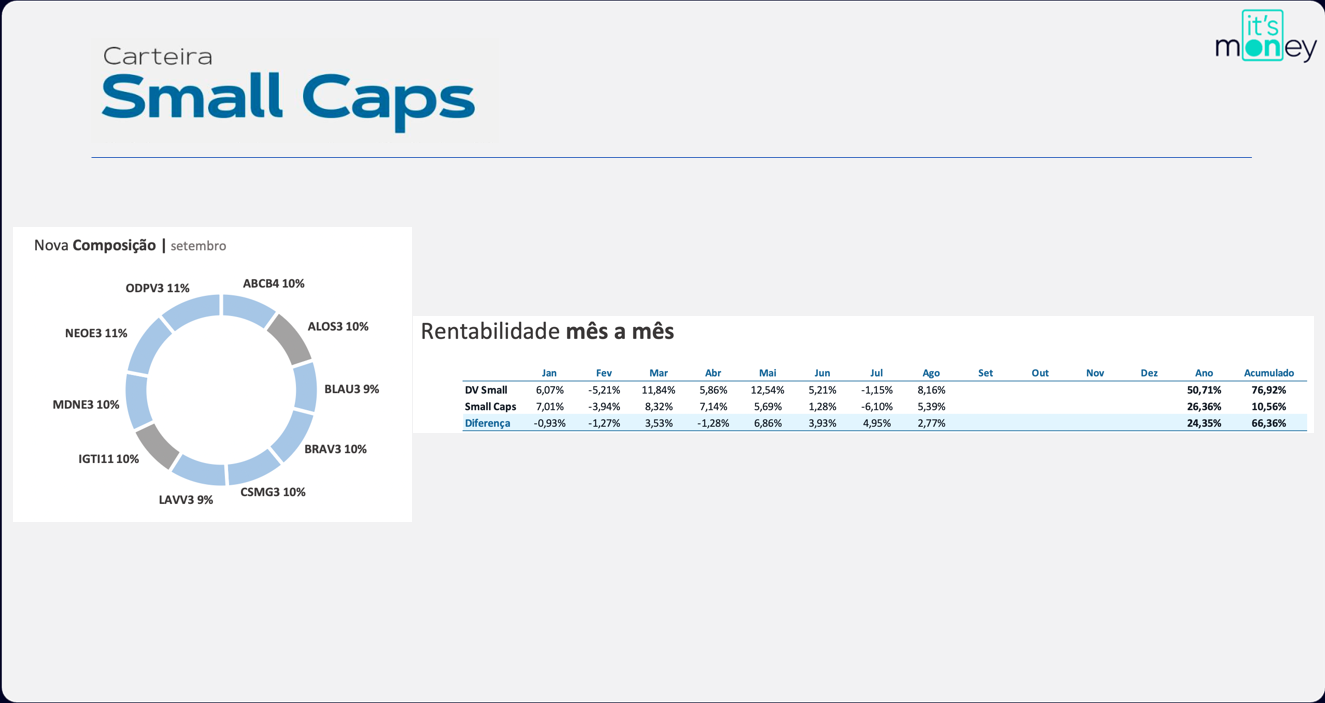 A carteira Small Caps registrou rentabilidade de 8,16% em agosto, superando o índice Small Caps que subiu 5,39%, resultando em uma diferença positiva de 2,77% no período.