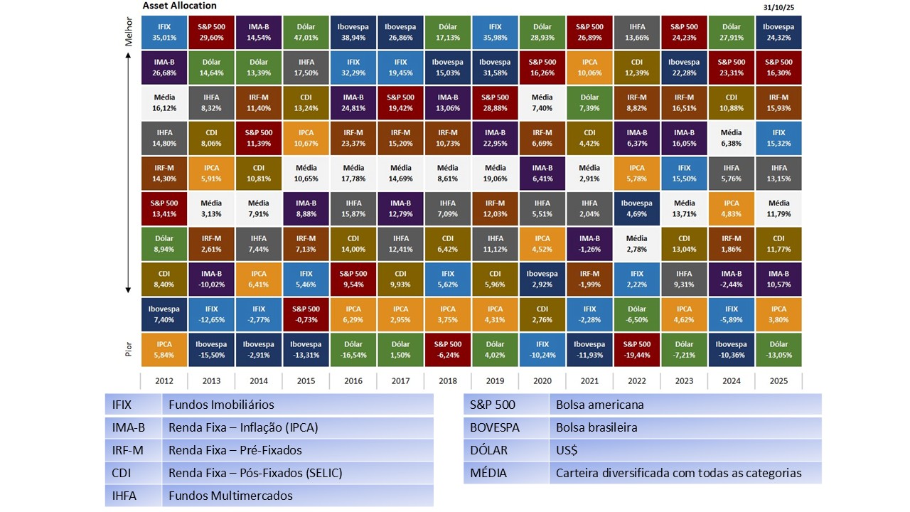 Espalhar dinheiro em classes e setores diferentes reduz o impacto de más notícias localizadas. Pense em um agricultor que planta soja, milho e café: se a geada derruba a safra de café, as outras culturas seguem garantindo renda.